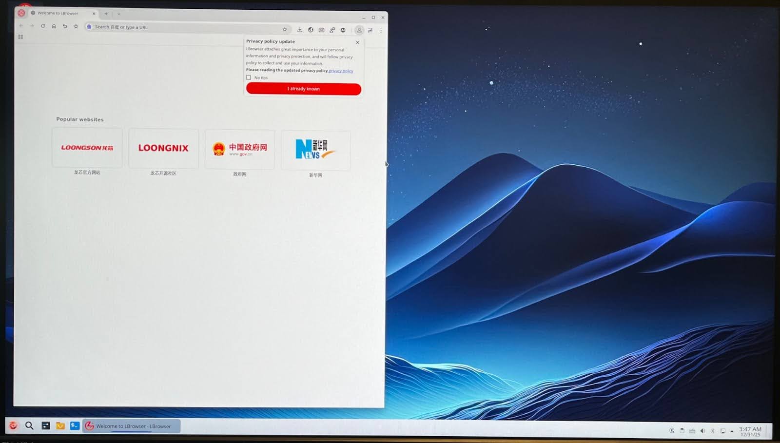Once plugged in and booted up, things feel pretty normal besides the loud fan that seems to be always on. On the screen, a variant of Debian called Loongnix boots up. The GUI seems to be KDE-based and comes with a custom browser “LBrowser” which is a fork of Chromium. Just because it was not obvious we document it here: the default root password is M700S. There is also a user account m700s with the same password.