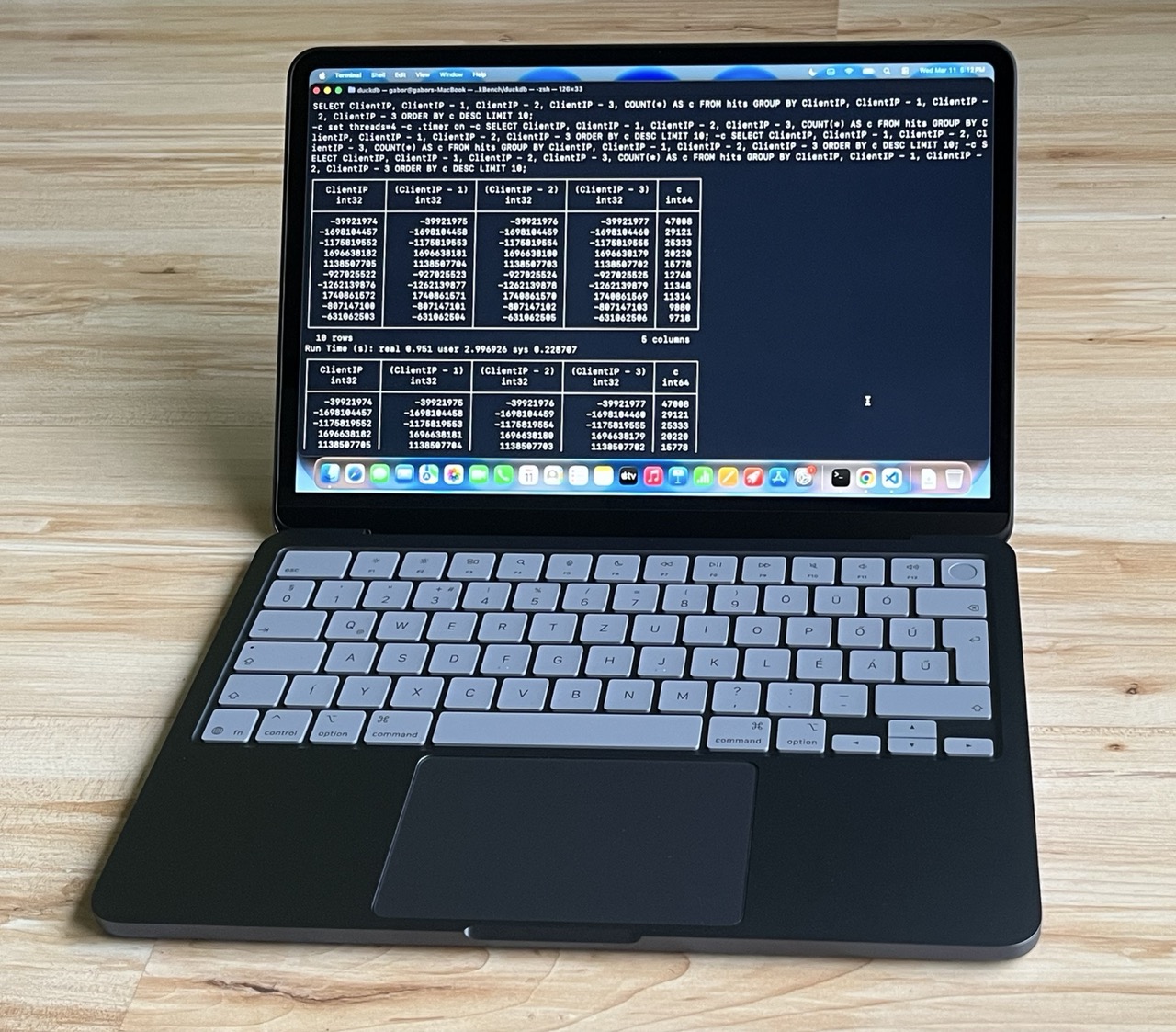 It turns out that we have already tested this phone under some unusual circumstances. Back in 2024, with DuckDB v1.2-dev, we found that the iPhone 16 Pro could complete all TPC-H queries at scale factor 100 in about 10 minutes when air-cooled and in less than 8 minutes while lying in a box of dry ice. The MacBook Neo should definitely be able to handle this workload – but maybe it can even handle a bit more. Cue the inevitable benchmarks!